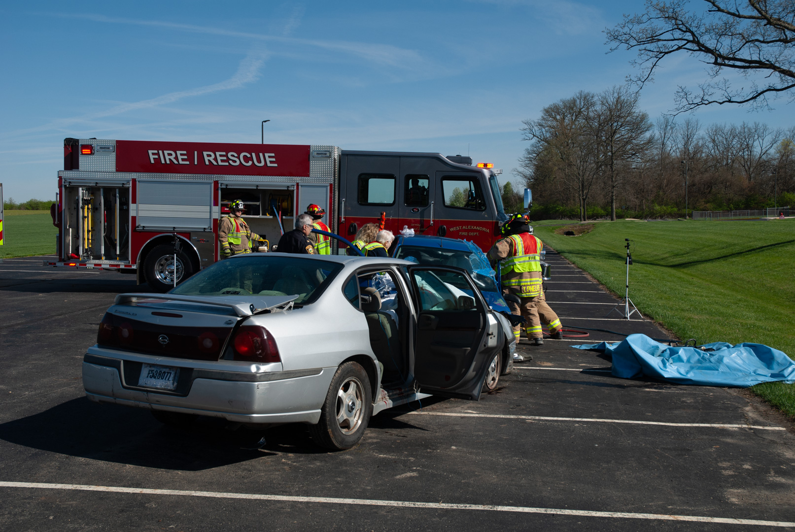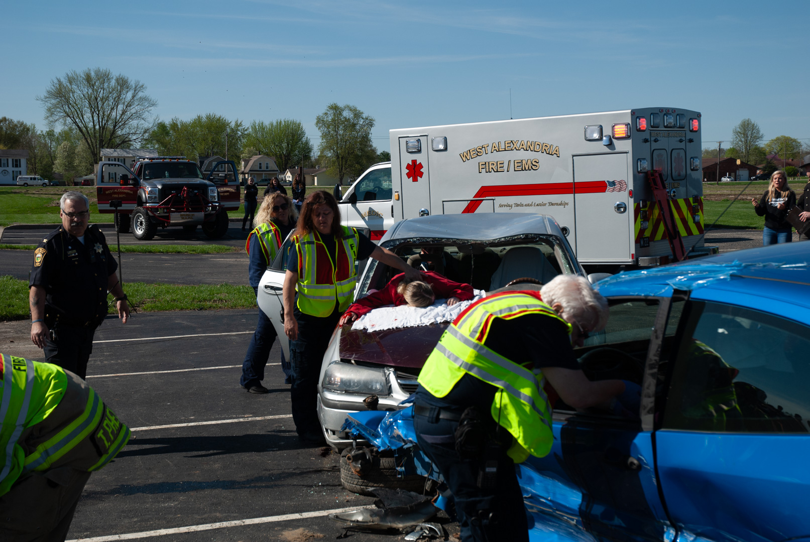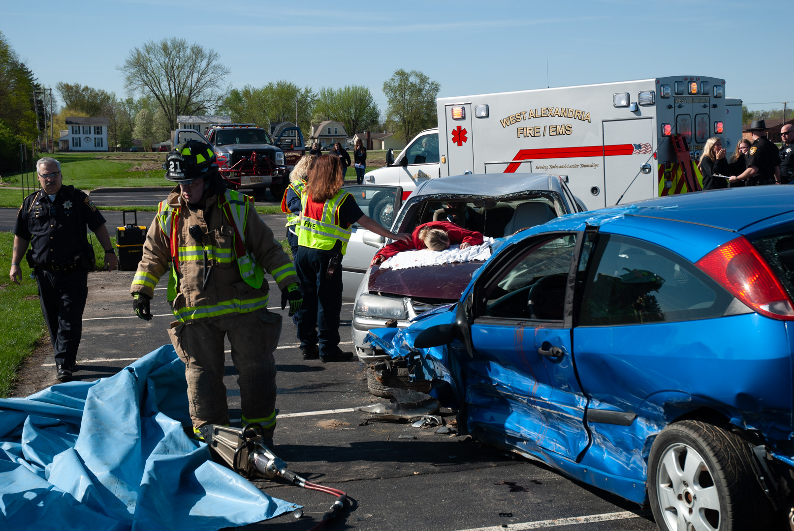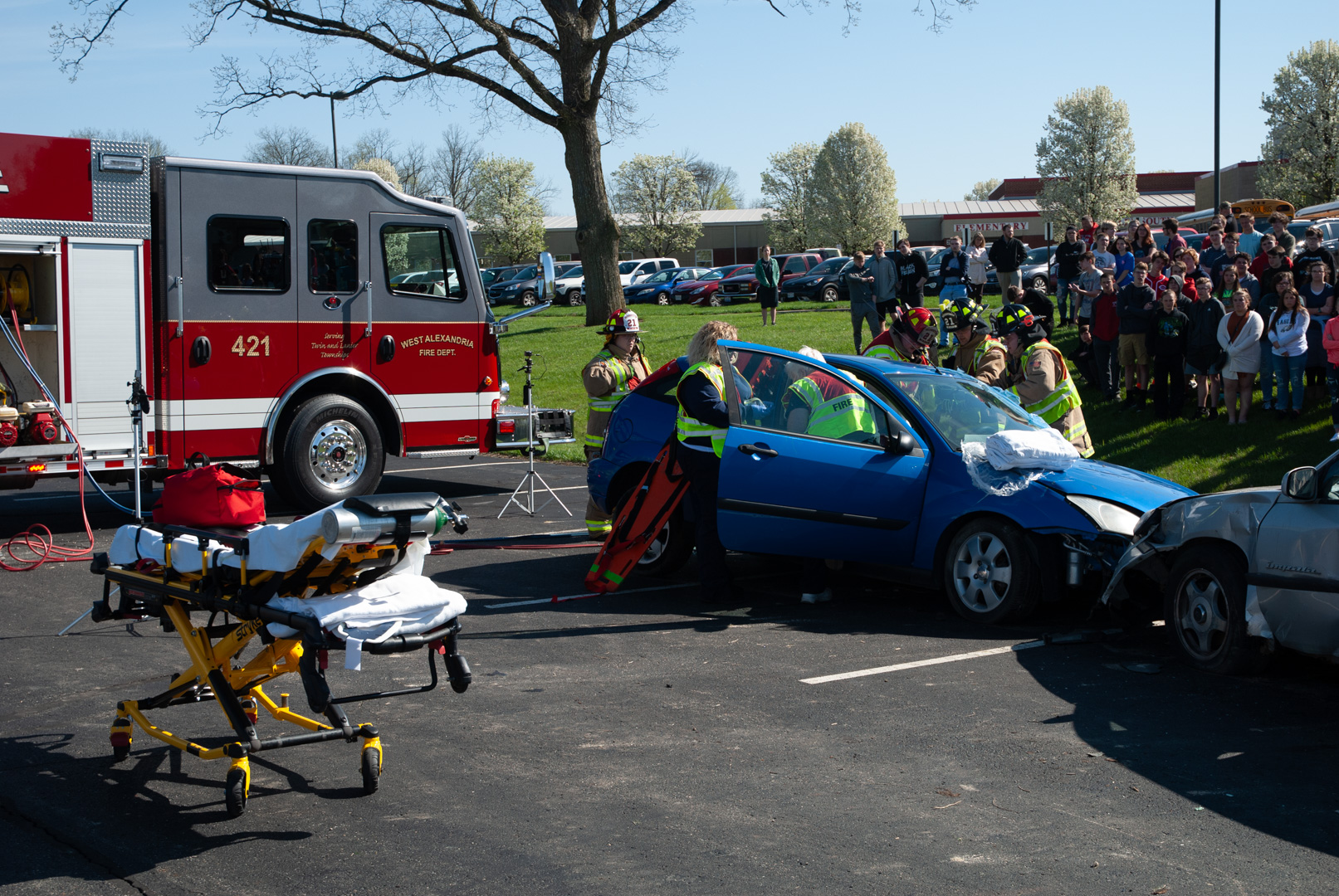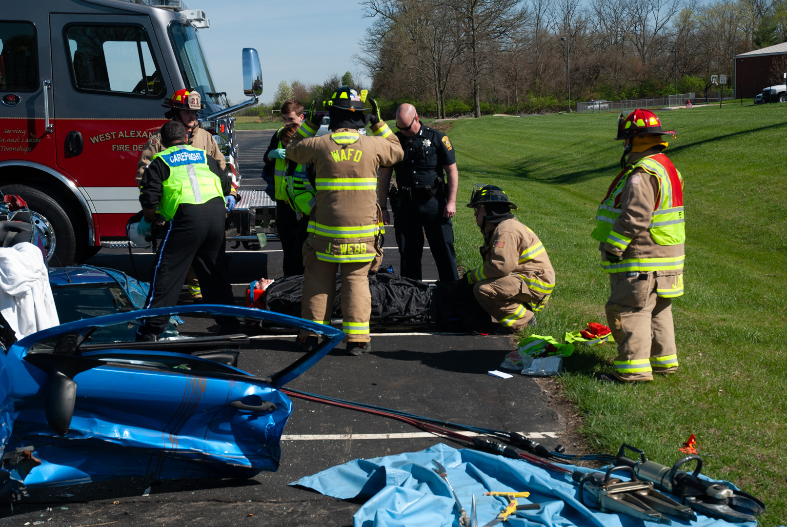Members of West Alexandria Fire and EMS, joined by Careflight, put on a "mock crash" for the students of Twin Valley High School to try to deter any prom night drinking and driving. April 22, 2019