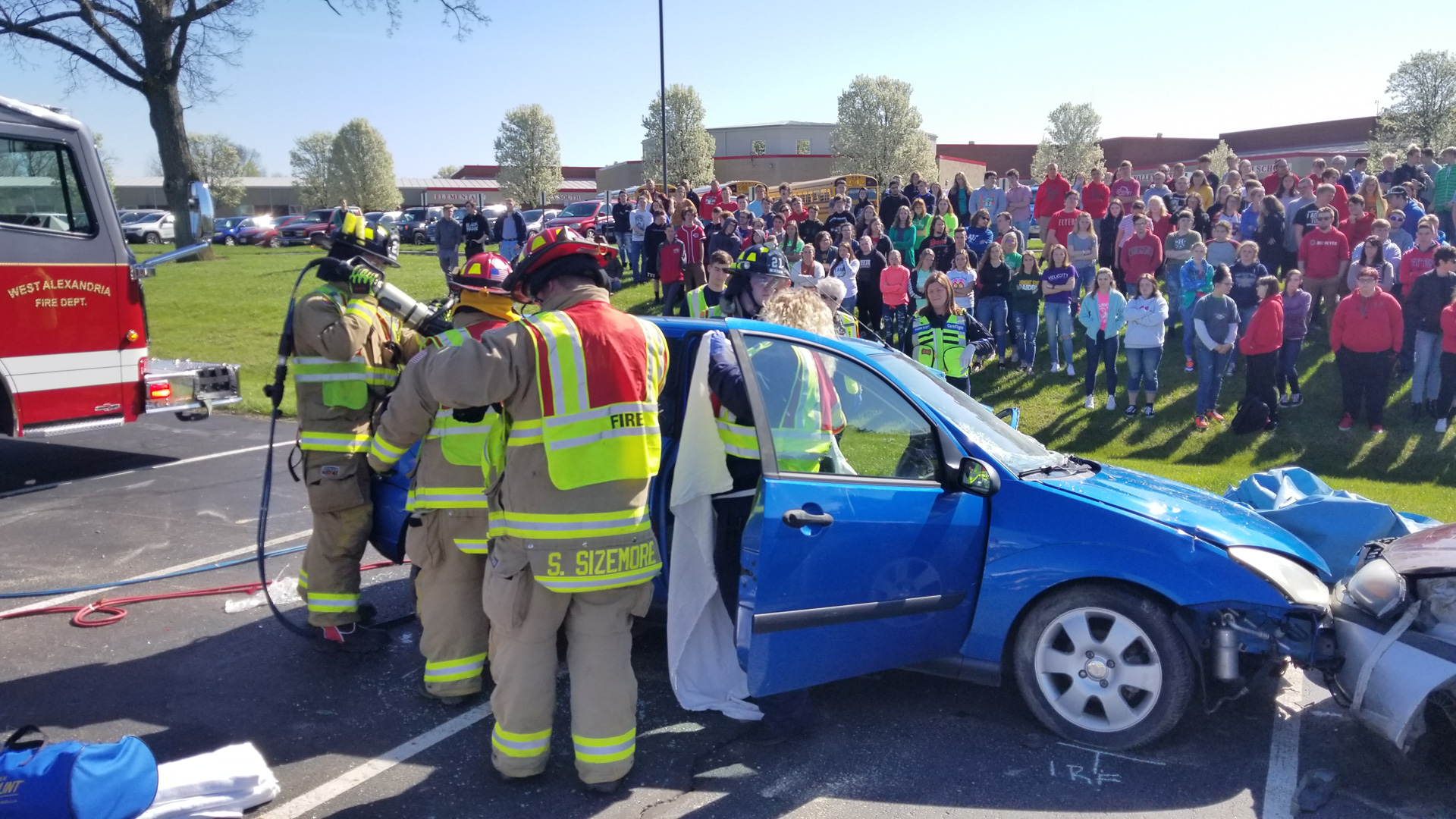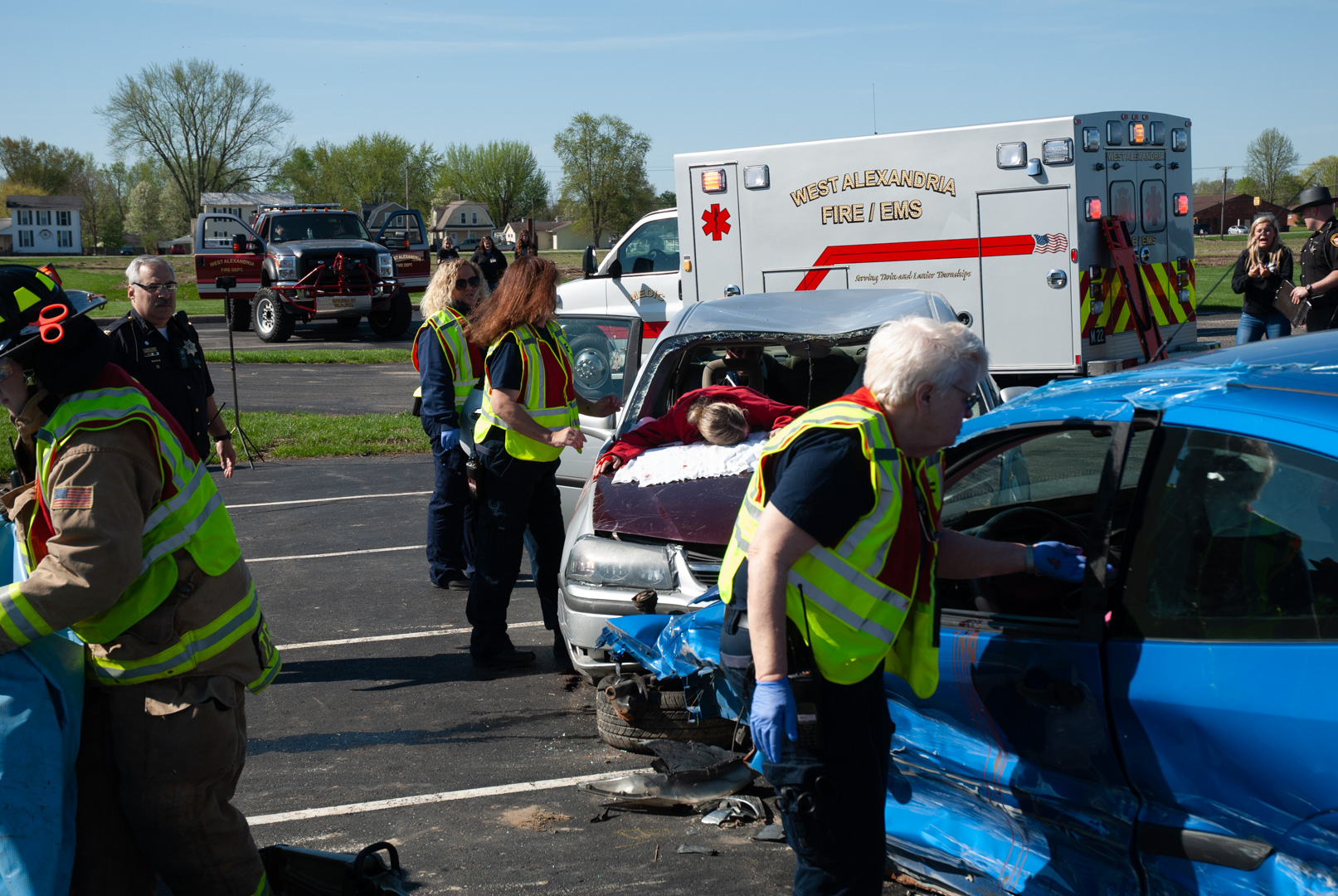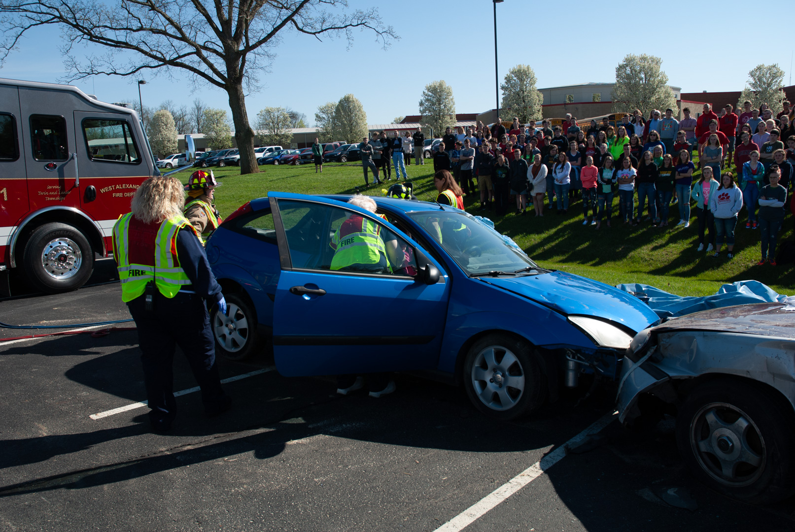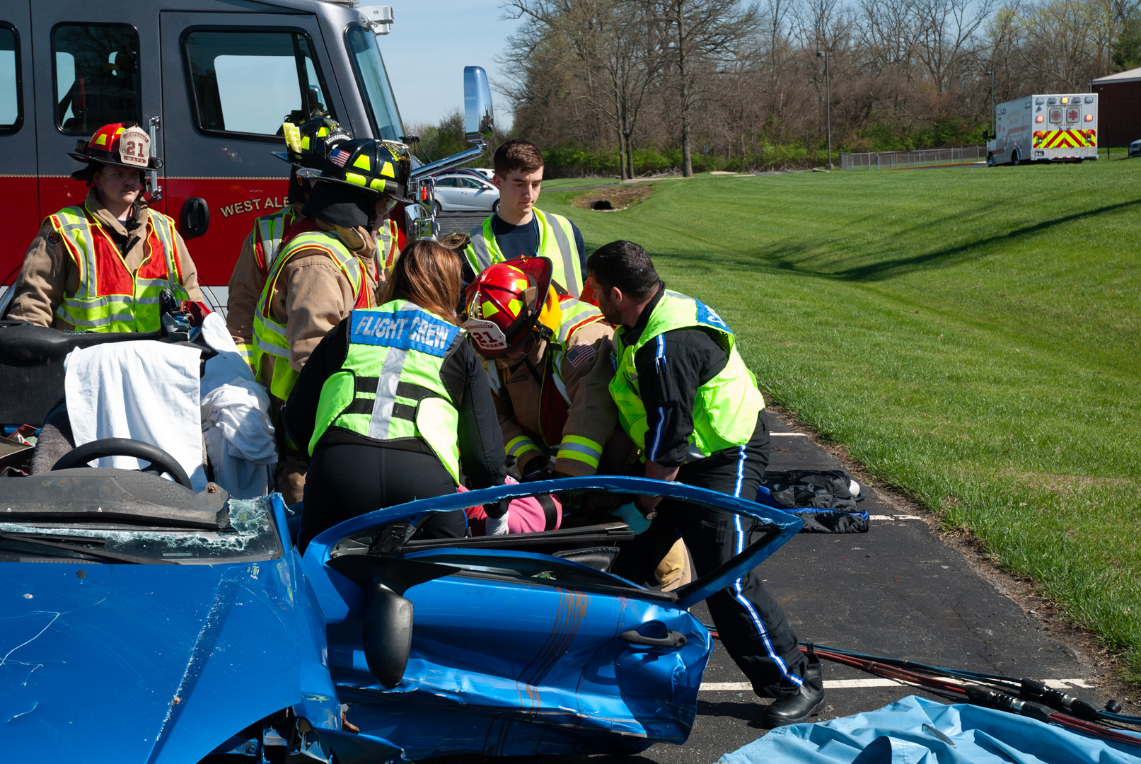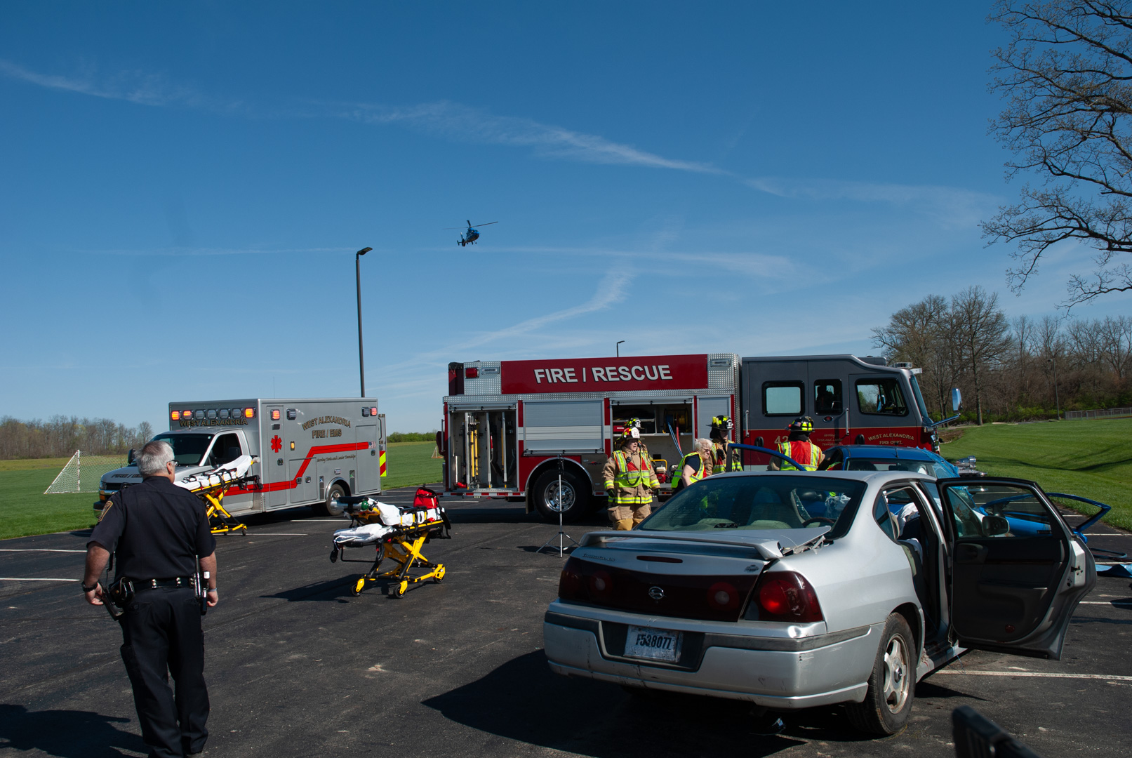 Members of West Alexandria Fire and EMS, joined by Careflight, put on a "mock crash" for the students of Twin Valley High School to try to deter any prom night drinking and driving. April 22, 2019