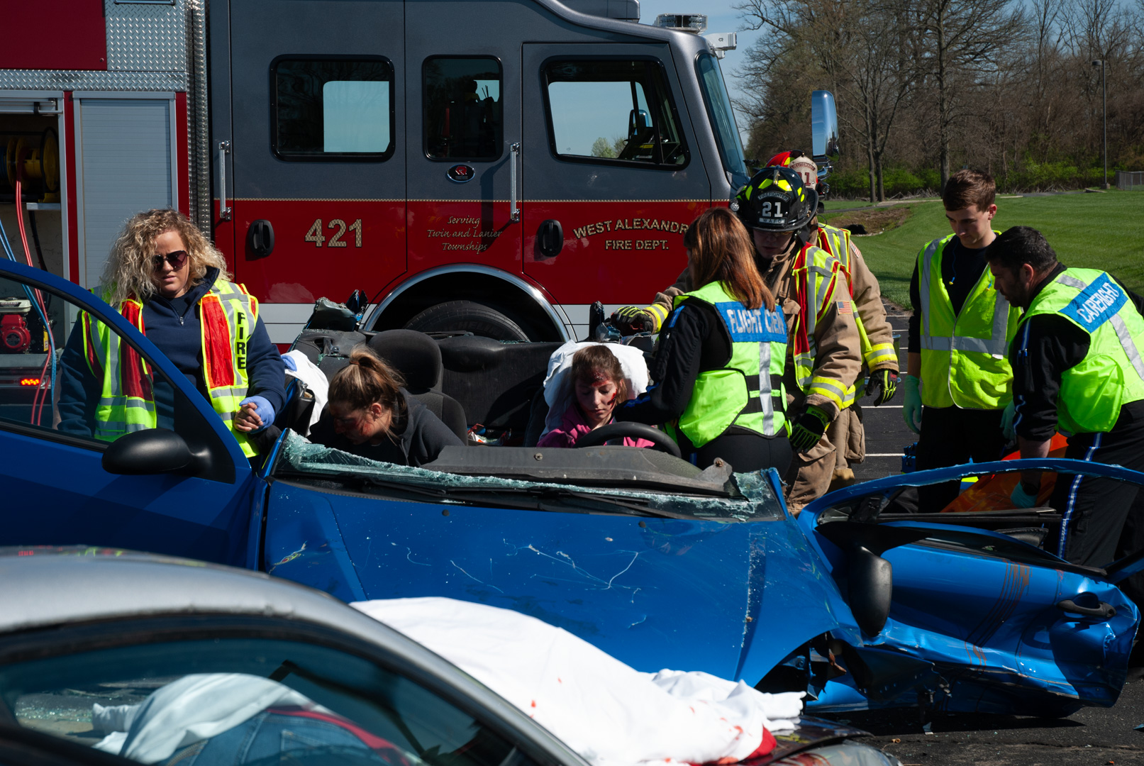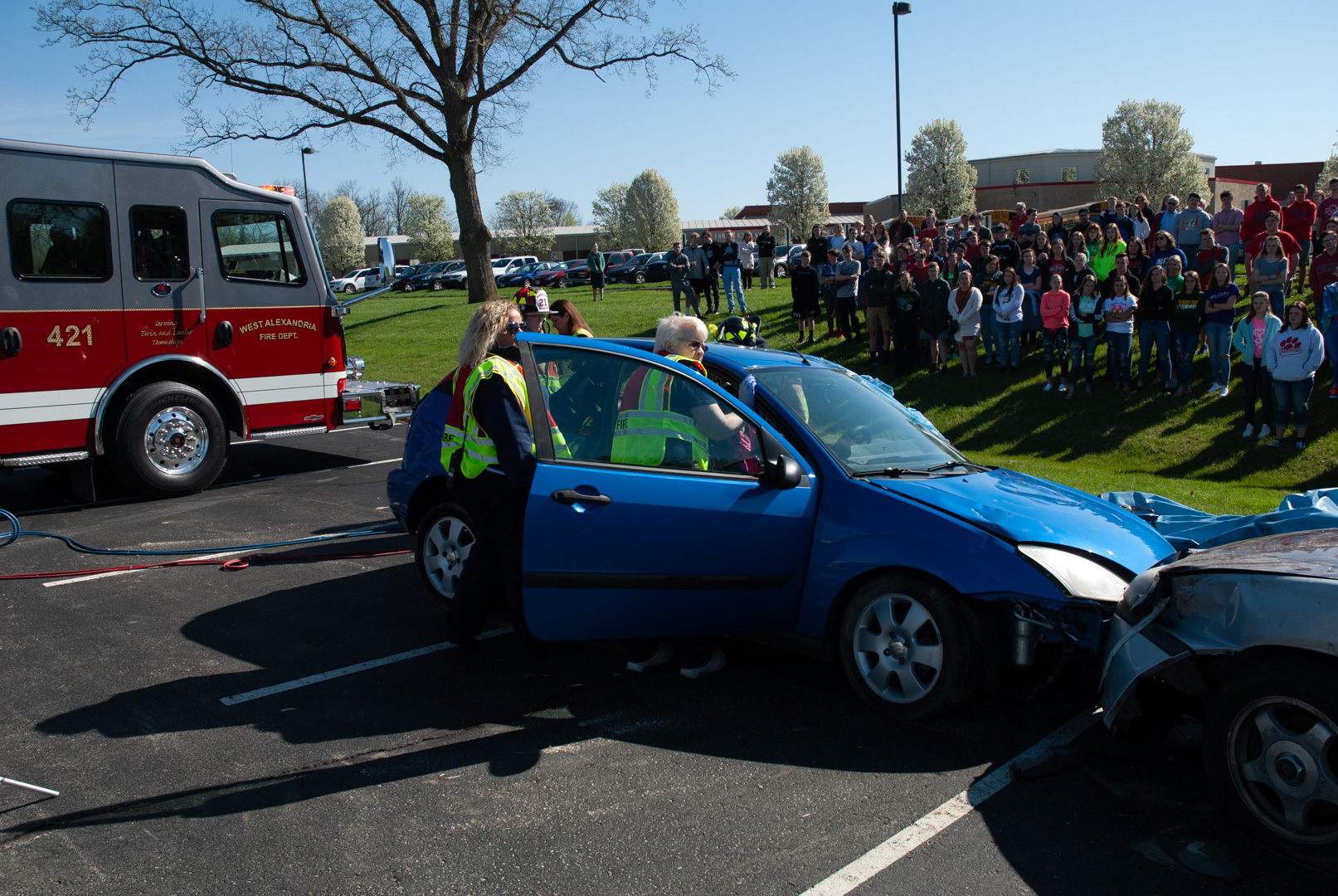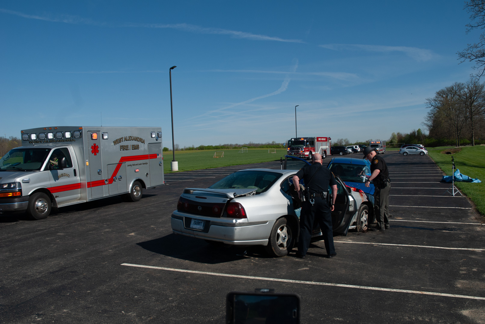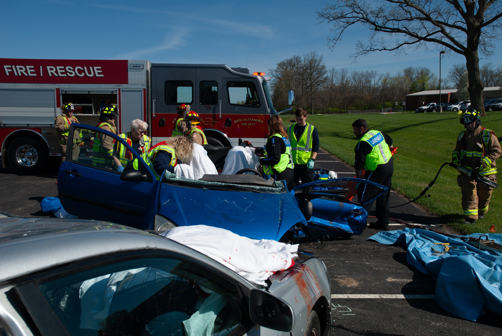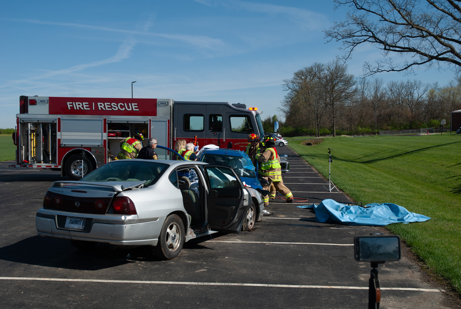 Members of West Alexandria Fire and EMS, joined by Careflight, put on a "mock crash" for the students of Twin Valley High School to try to deter any prom night drinking and driving. April 22, 2019
