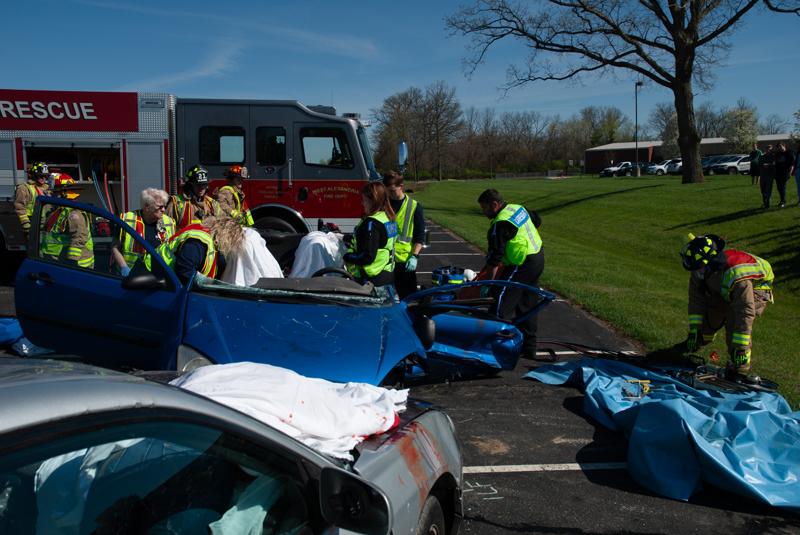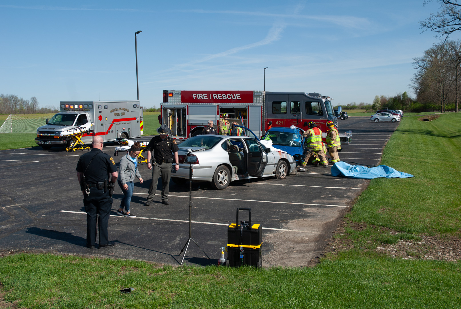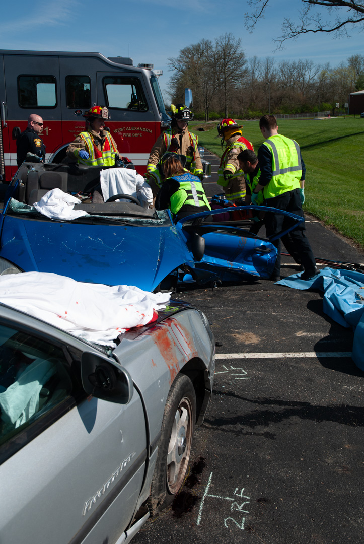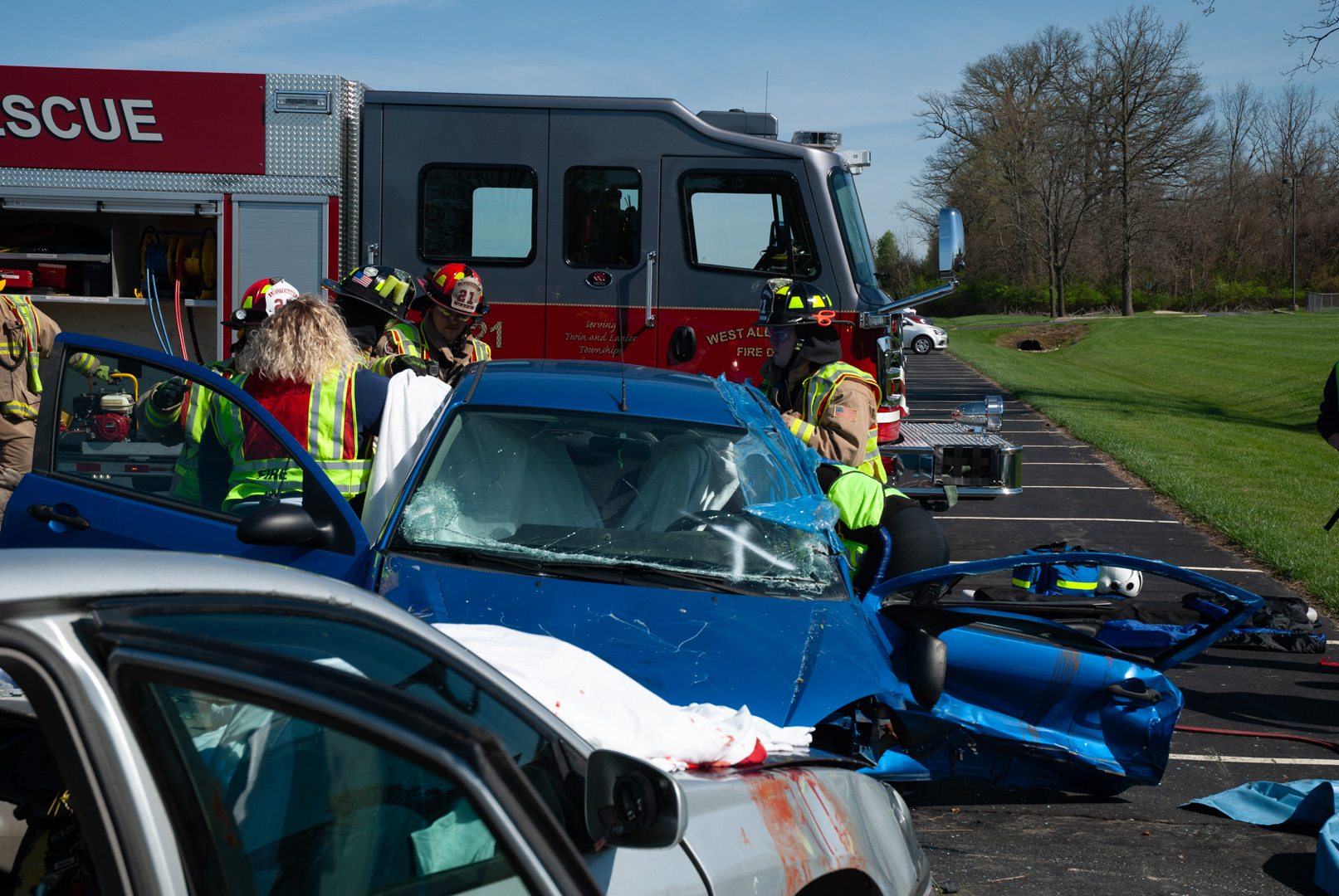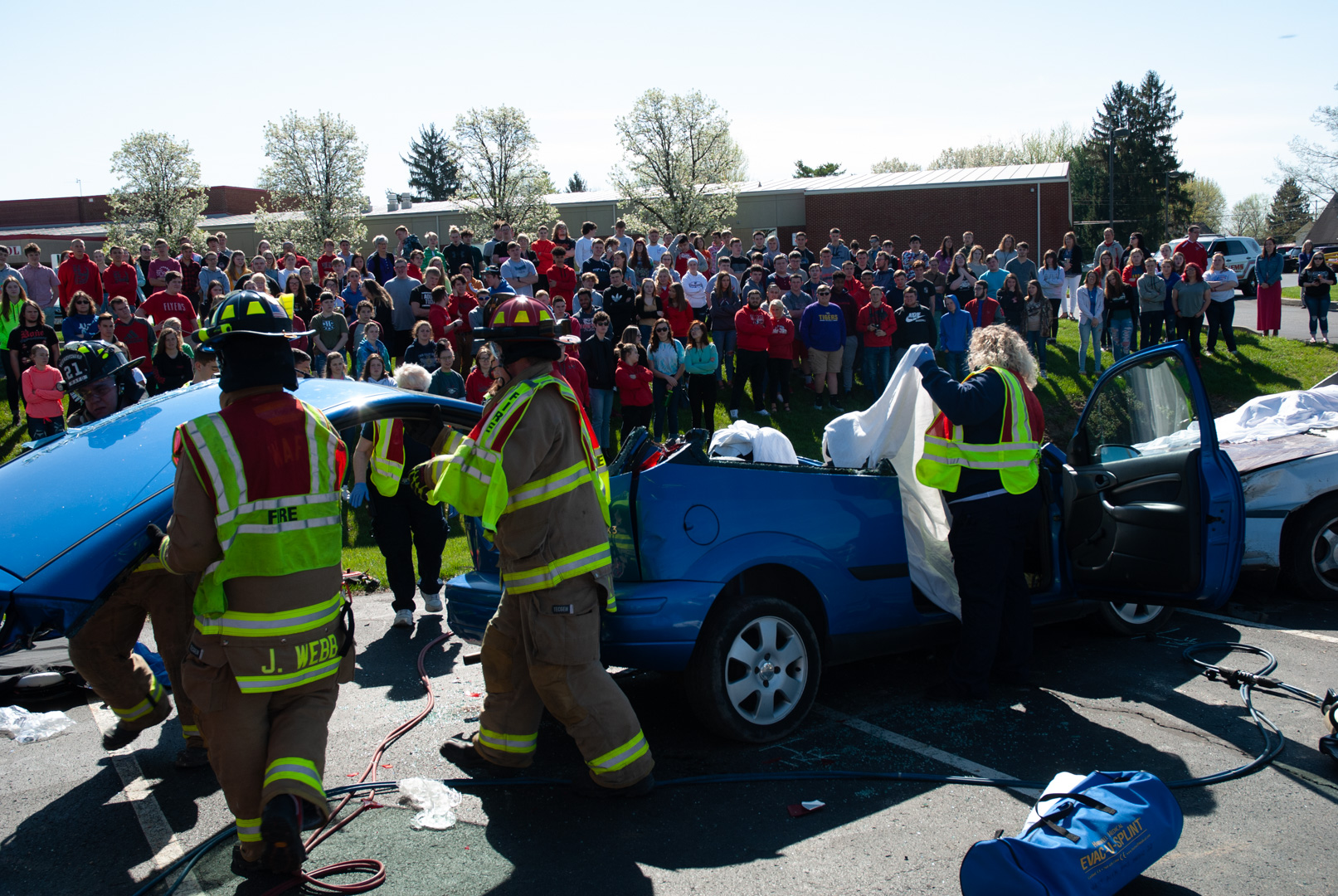 Members of West Alexandria Fire and EMS, joined by Careflight, put on a "mock crash" for the students of Twin Valley High School to try to deter any prom night drinking and driving. April 22, 2019