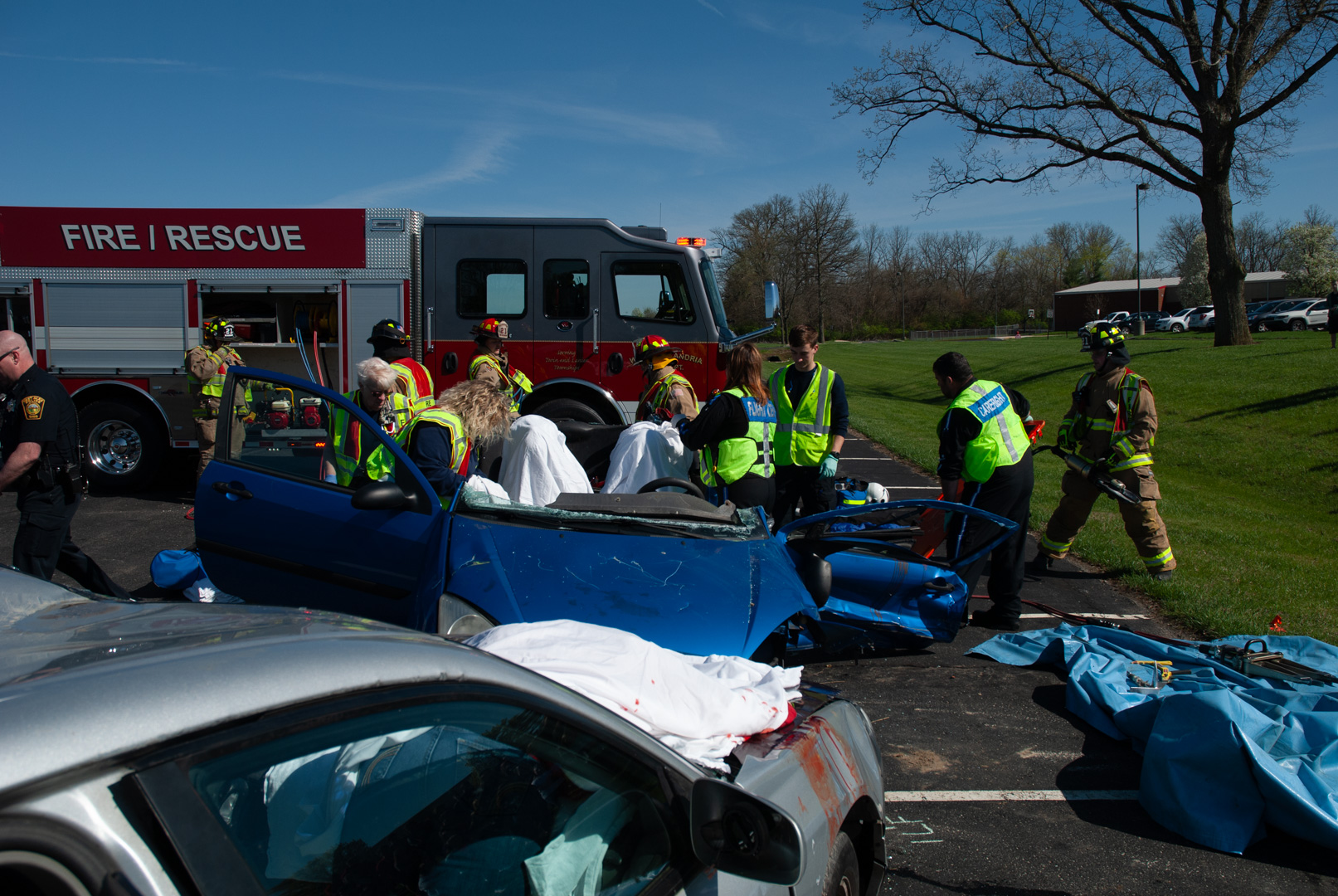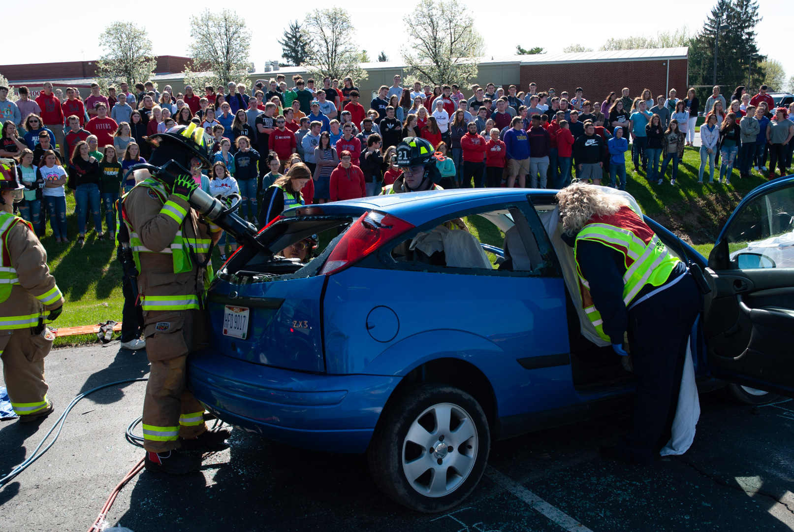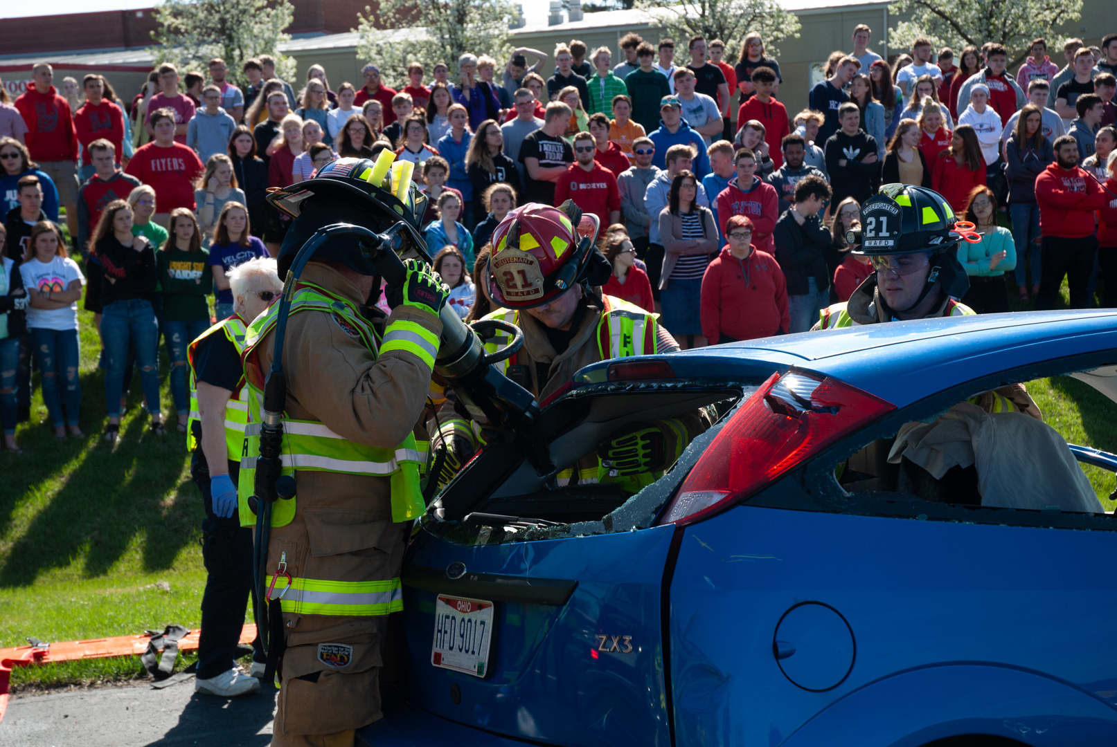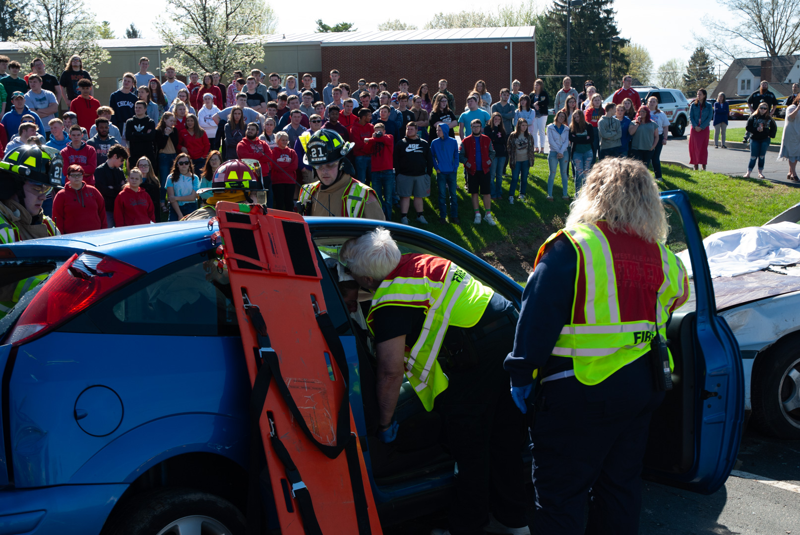 Members of West Alexandria Fire and EMS, joined by Careflight, put on a "mock crash" for the students of Twin Valley High School to try to deter any prom night drinking and driving. April 22, 2019