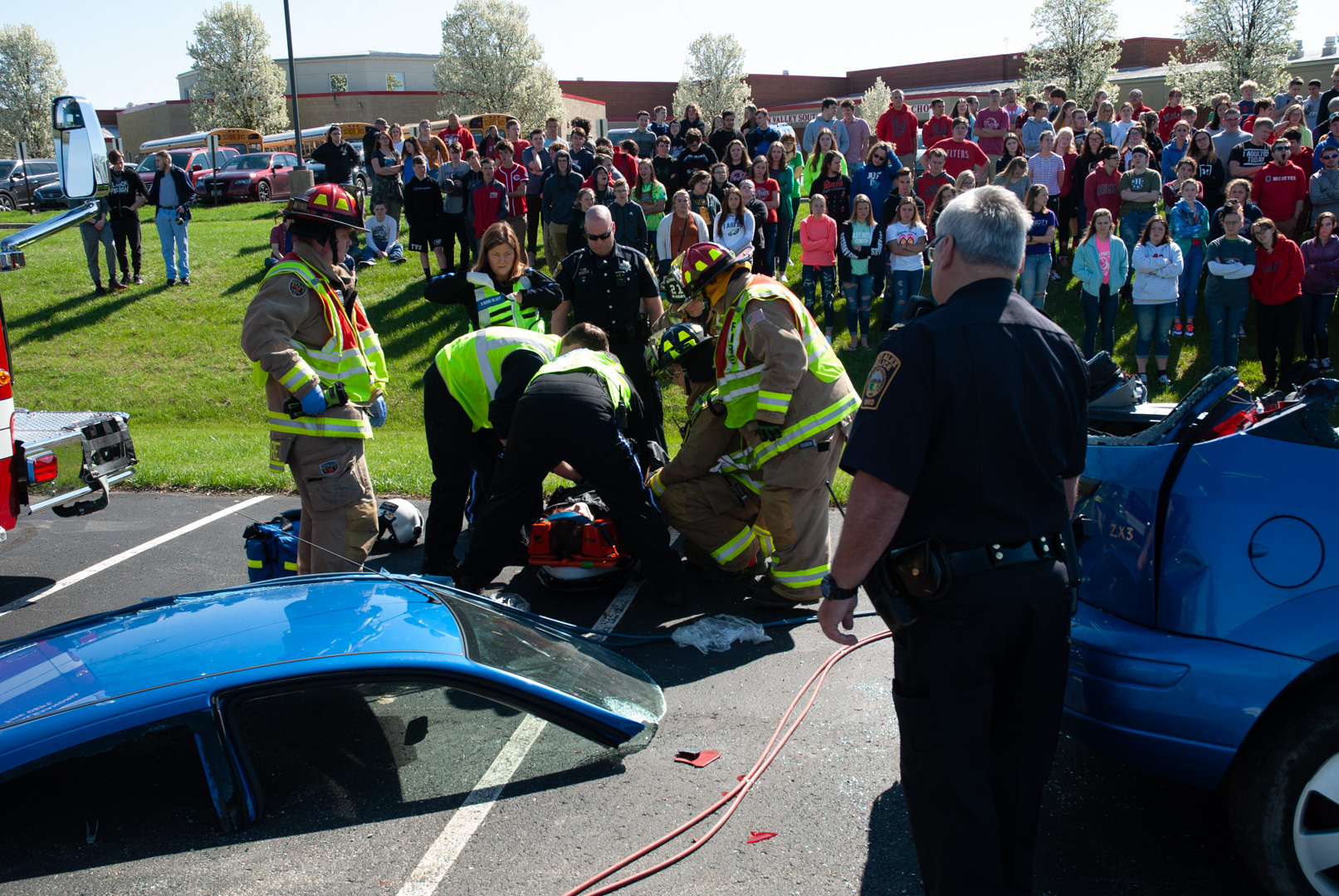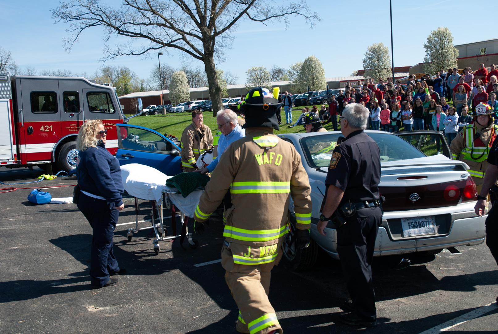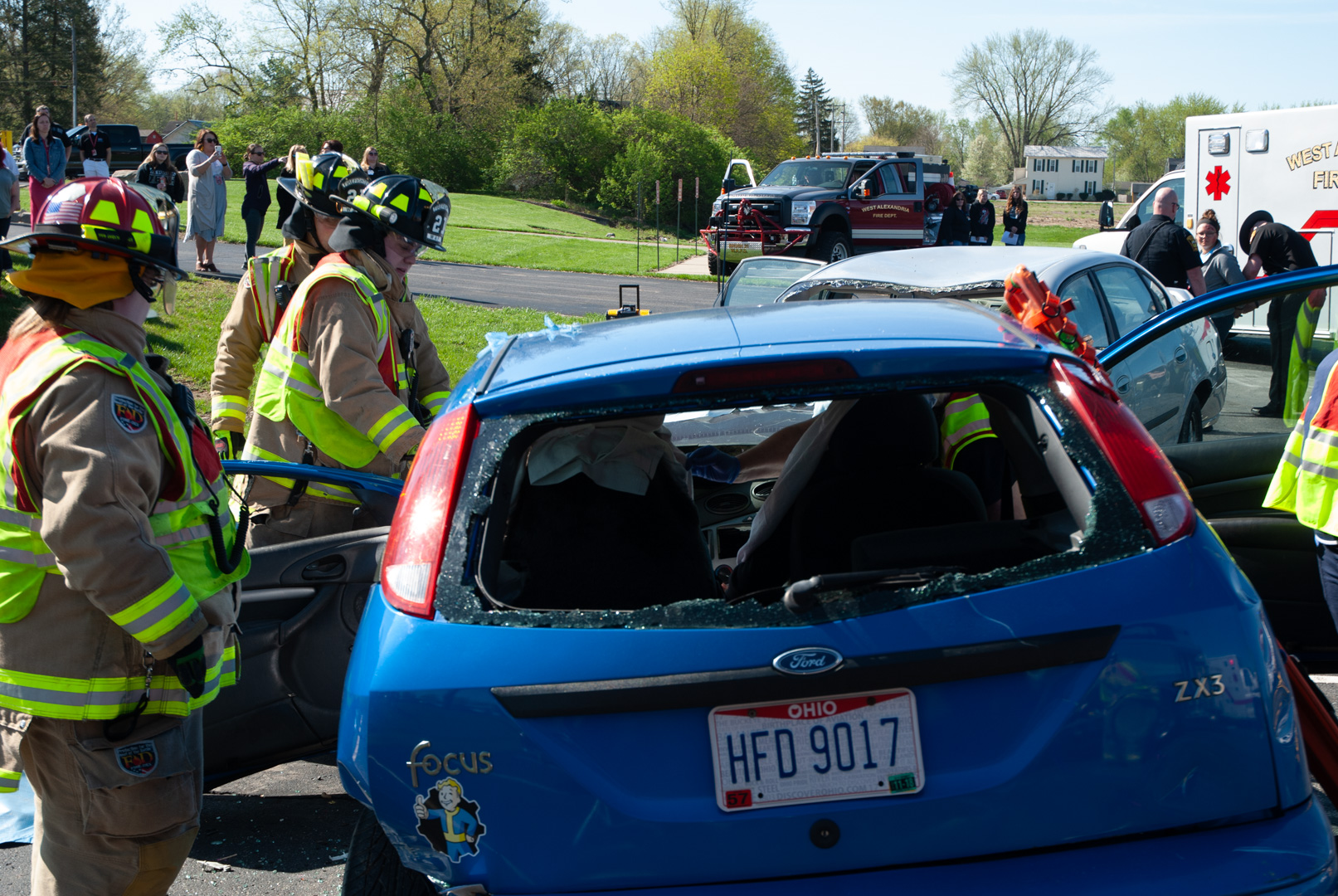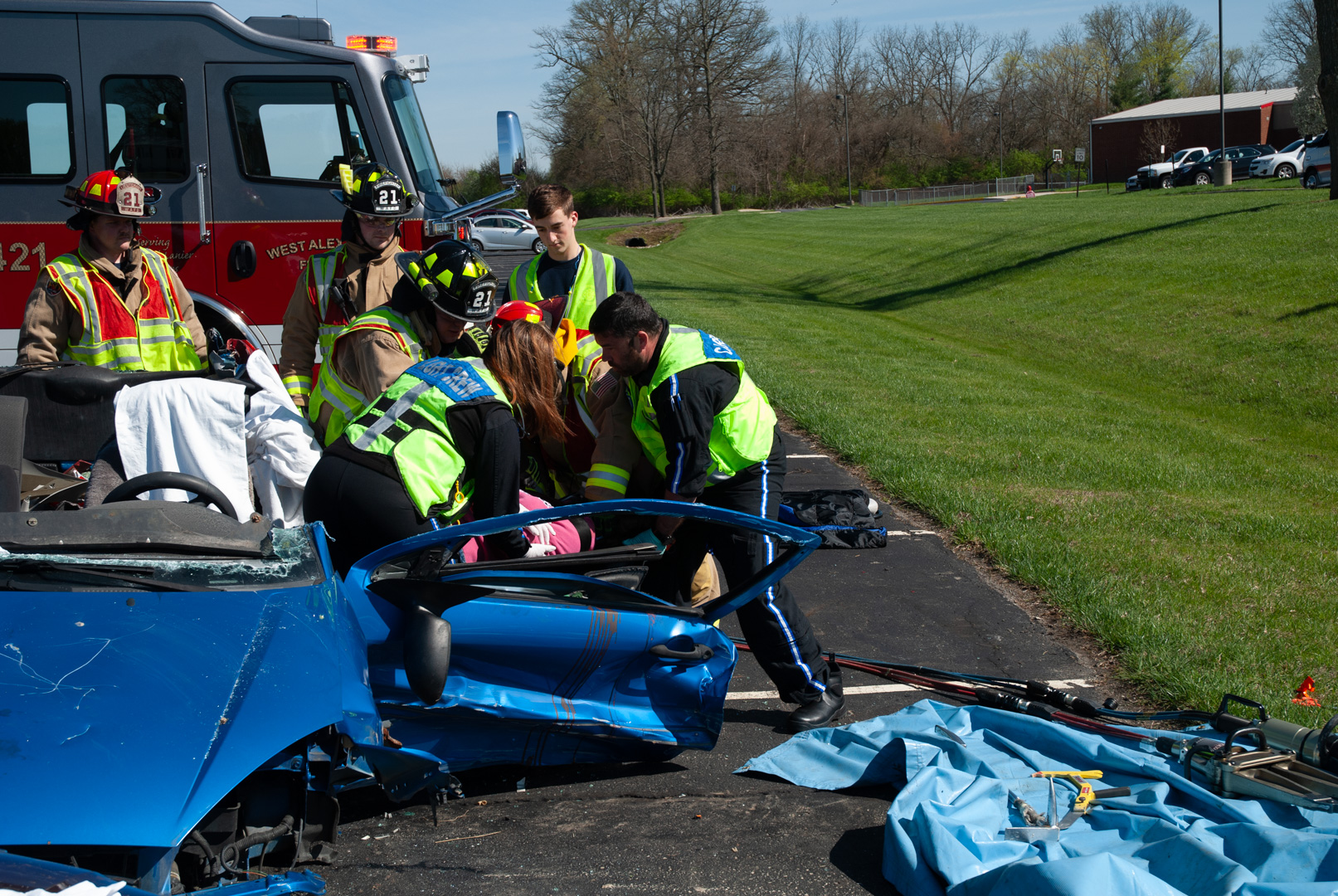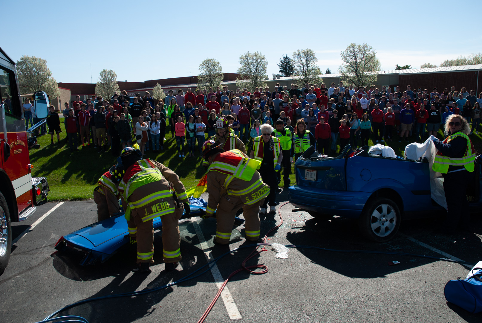 Members of West Alexandria Fire and EMS, joined by Careflight, put on a "mock crash" for the students of Twin Valley High School to try to deter any prom night drinking and driving. April 22, 2019