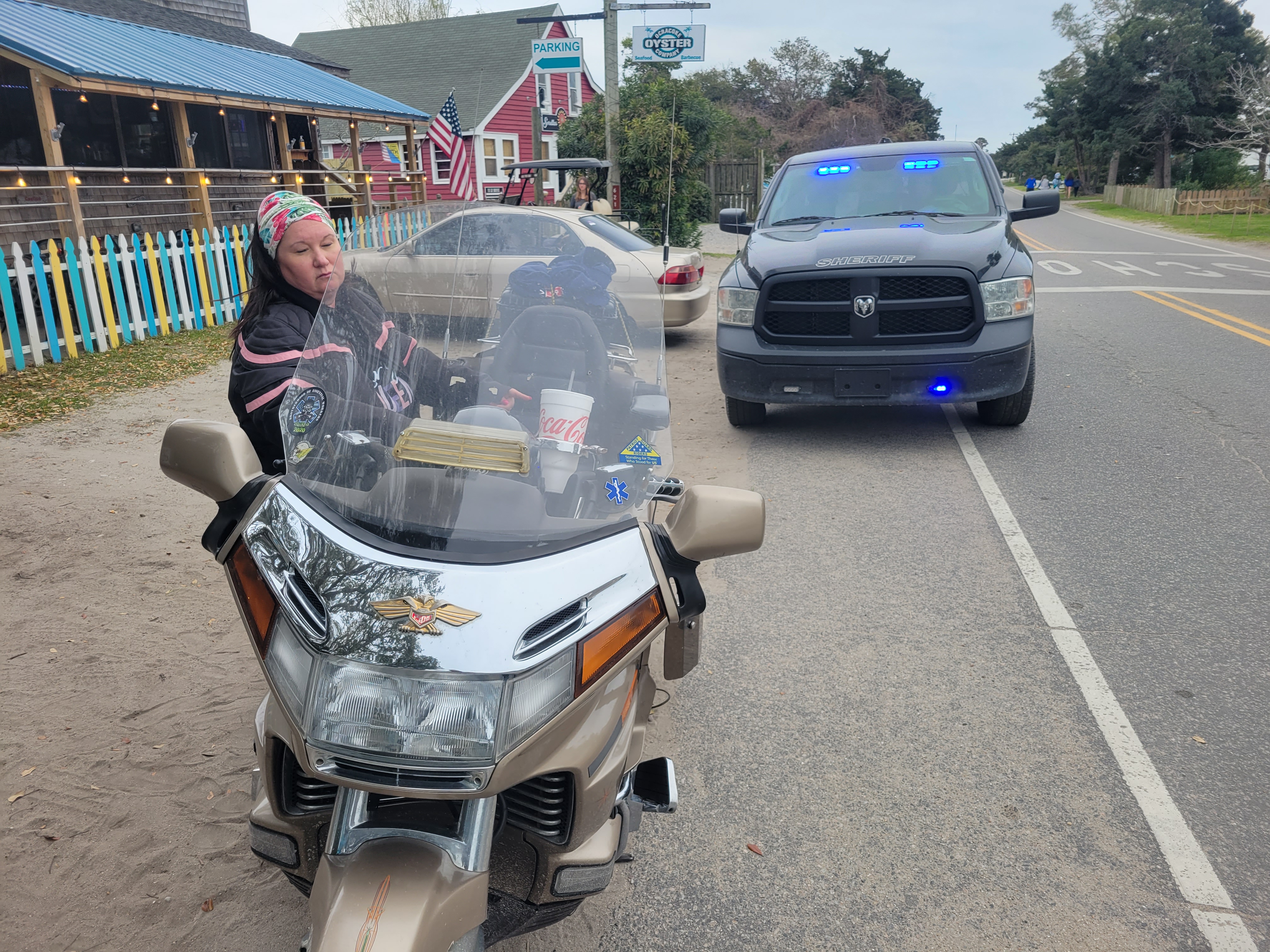 For our March trip to the Outer Banks we trailered the Goldwing along and decided to take it to Ocracoke Island for the day. Unfortunately, we discovered that North Carolina is a helmet law state the hard way in a moment of indiscretion when making a quick trip from one stop to another. Oooops.