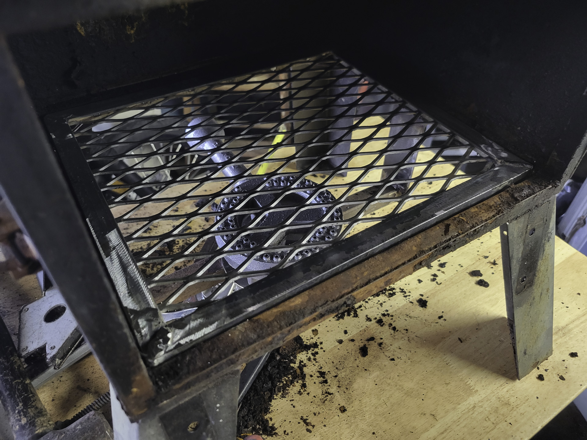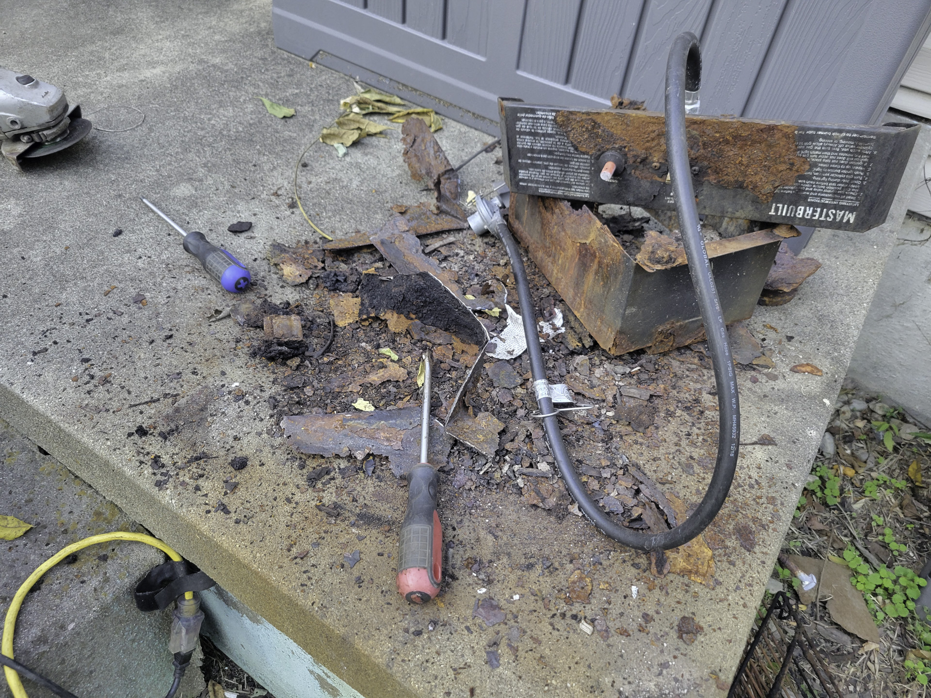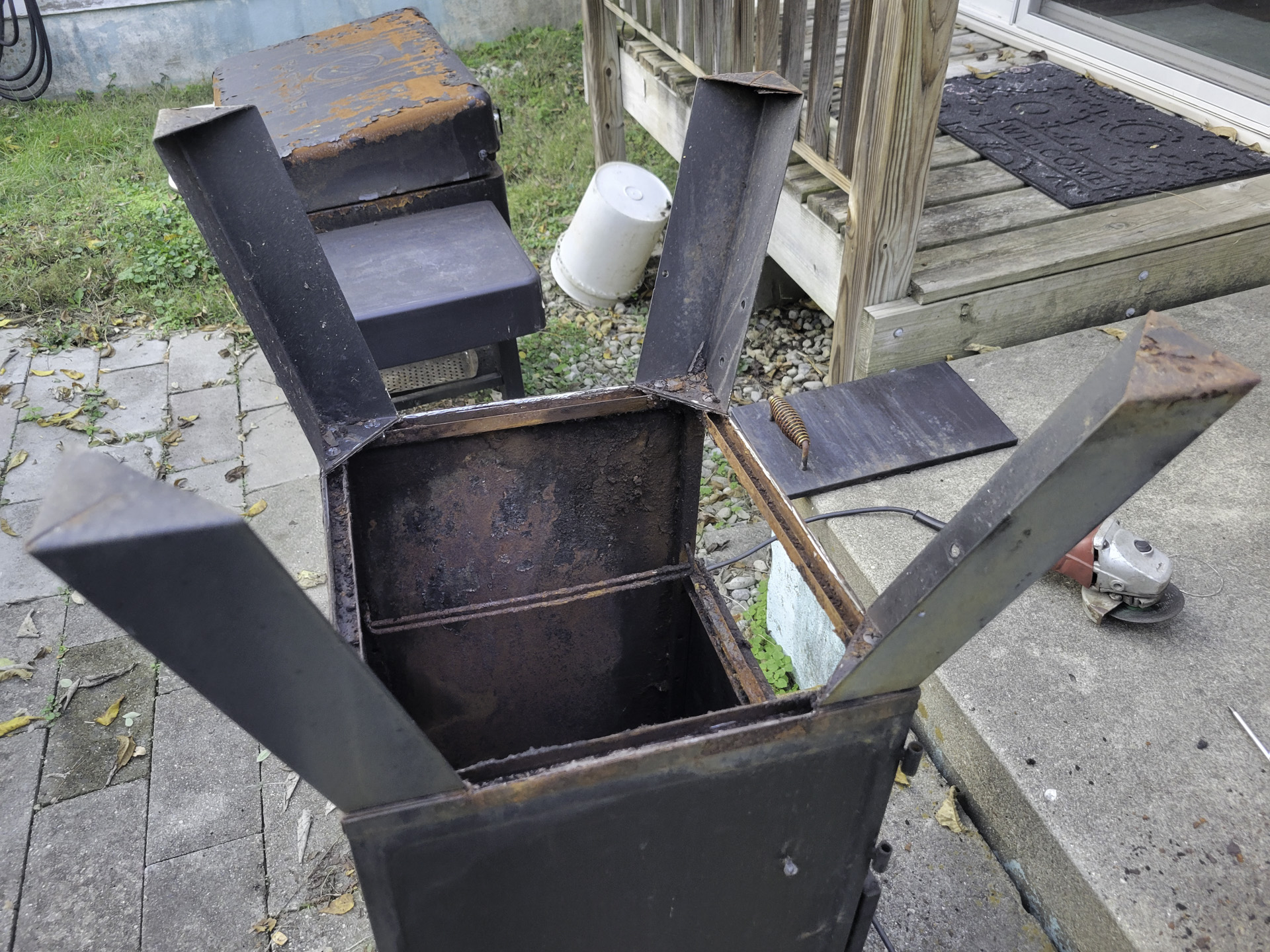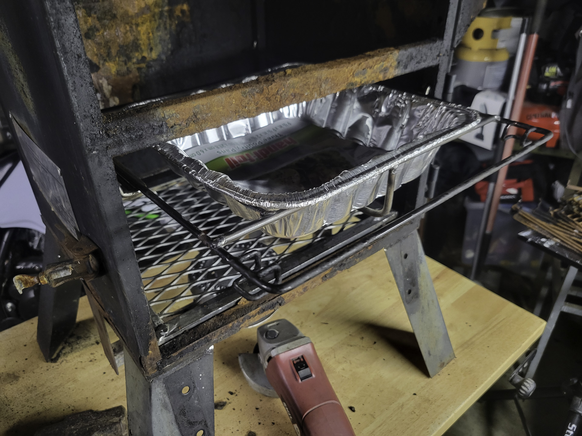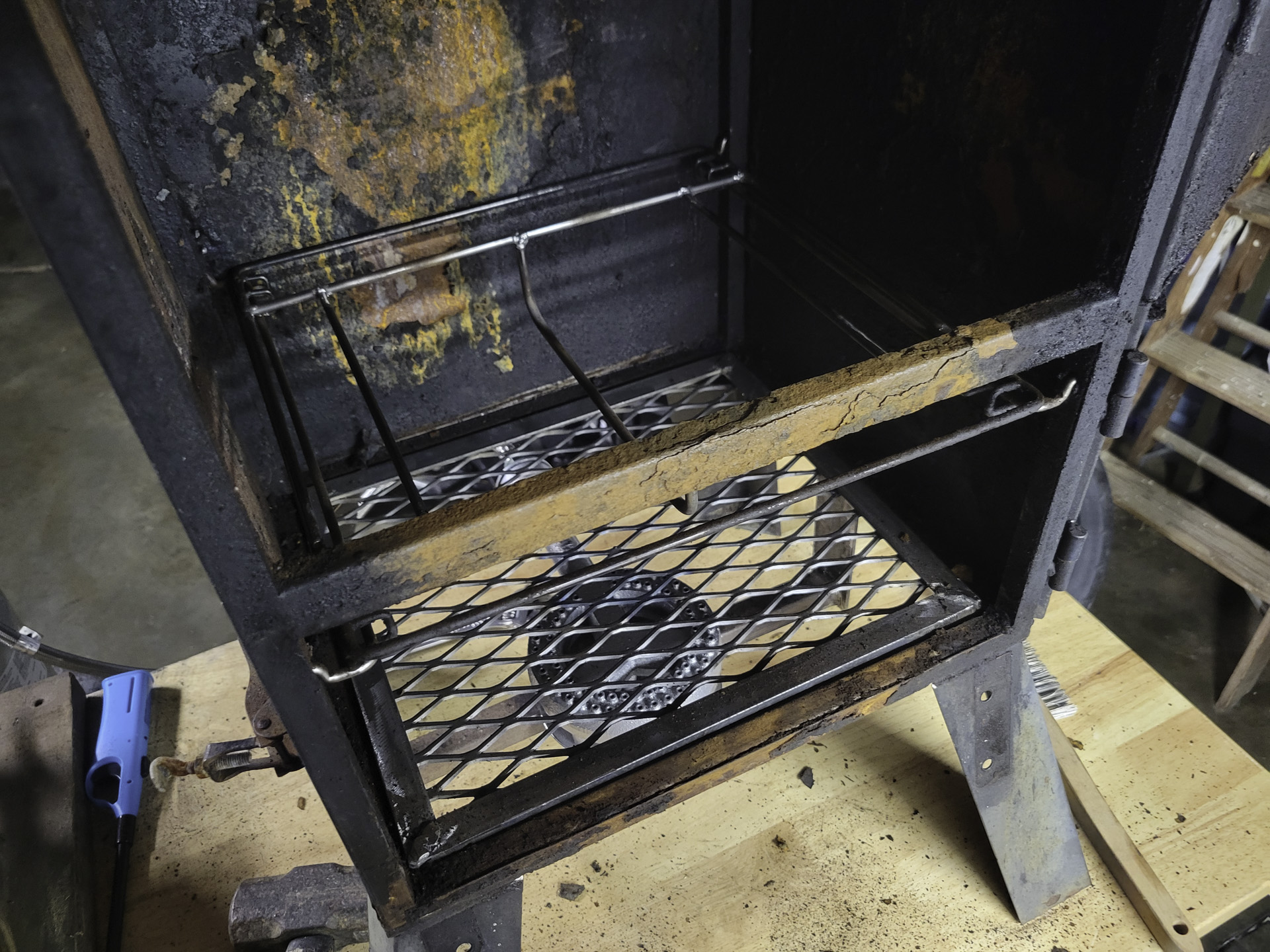 If you've known me for any length of time, you know I love smoked meats of pretty much any variety. I've had and loved my Masterbuilt smoker for YEARS, and I literally ran in until the wood pan rusted through, the brine pan was so concreted it wasn't usable and the burner was essentially dissolving underneath it. It's been down for a while, but Thanksgiving is coming up, and we just couldn't be without the famous Weigold Mountain Smoked Turkey. So I got to work. Here's some pictures of the progress. I'm pleased to report that the old gal is finally smoke ready again after a test run, so as soon as I get something smokable thawed, she's going to get another run. She got a new propane burner, a custom fabricated burner mount, a newly fabricated wood rack and the brine tray holder revised to support a standard disposable aluminum cooking pan.