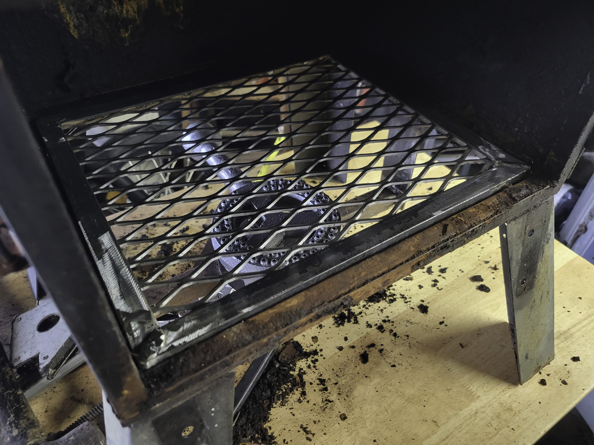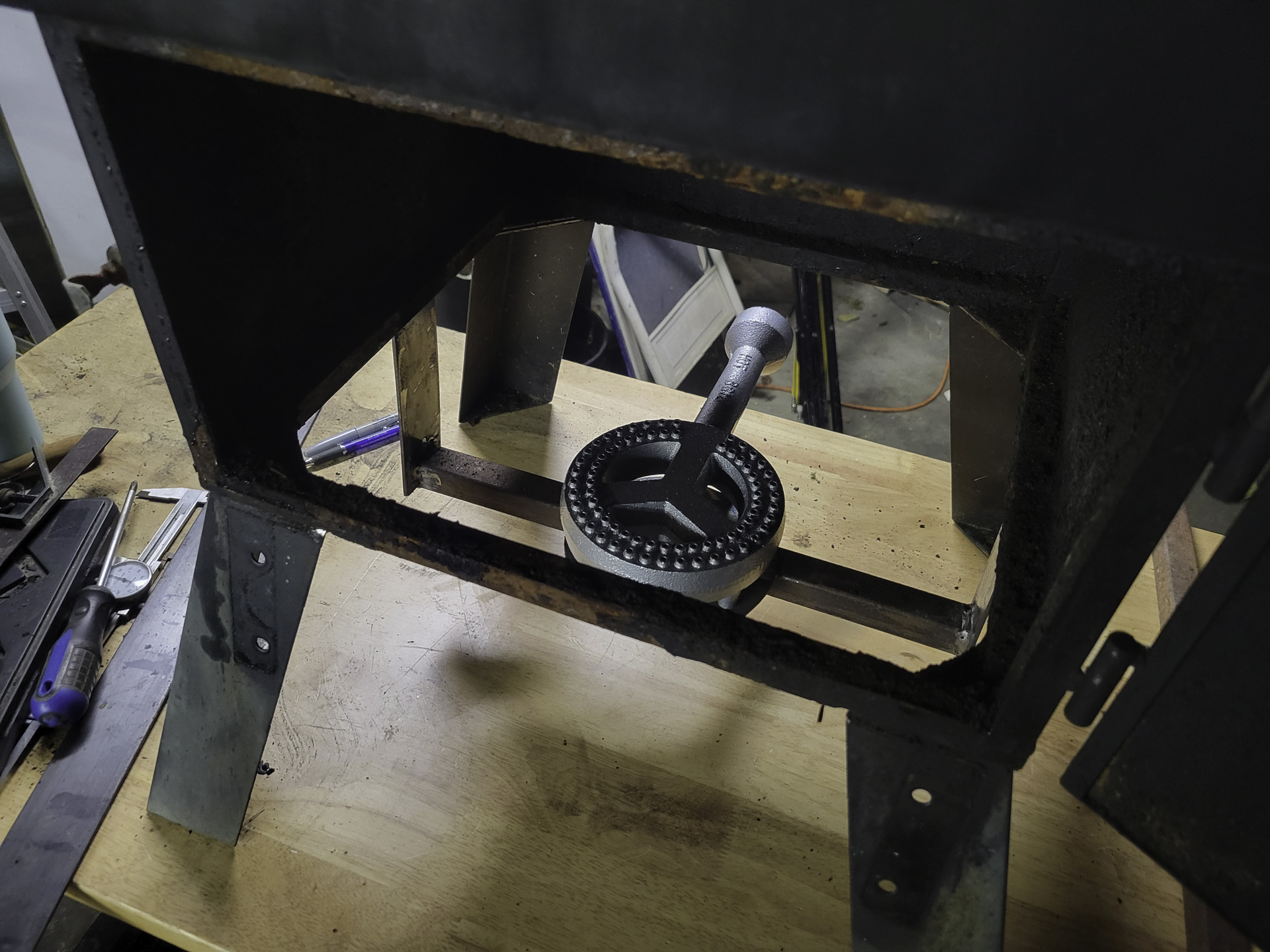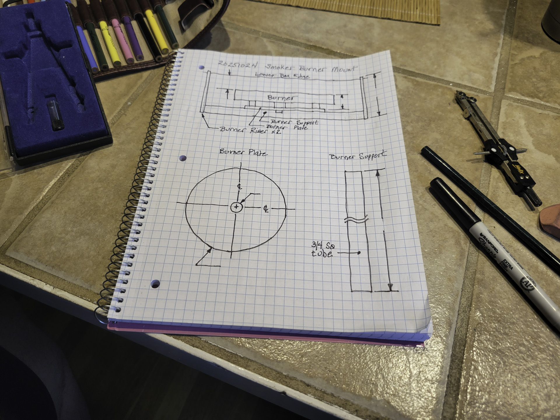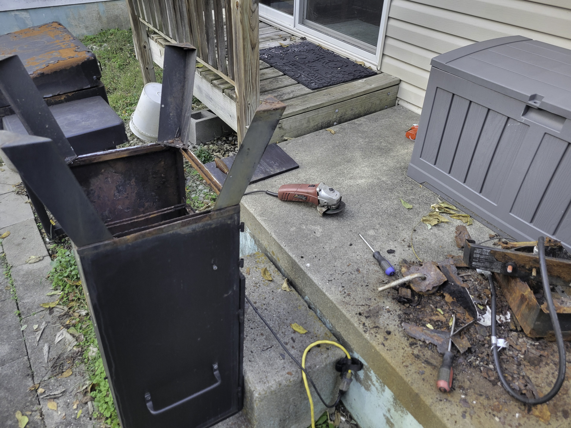 If you've known me for any length of time, you know I love smoked meats of pretty much any variety. I've had and loved my Masterbuilt smoker for YEARS, and I literally ran in until the wood pan rusted through, the brine pan was so concreted it wasn't usable and the burner was essentially dissolving underneath it. It's been down for a while, but Thanksgiving is coming up, and we just couldn't be without the famous Weigold Mountain Smoked Turkey. So I got to work. Here's some pictures of the progress. I'm pleased to report that the old gal is finally smoke ready again after a test run, so as soon as I get something smokable thawed, she's going to get another run. She got a new propane burner, a custom fabricated burner mount, a newly fabricated wood rack and the brine tray holder revised to support a standard disposable aluminum cooking pan.