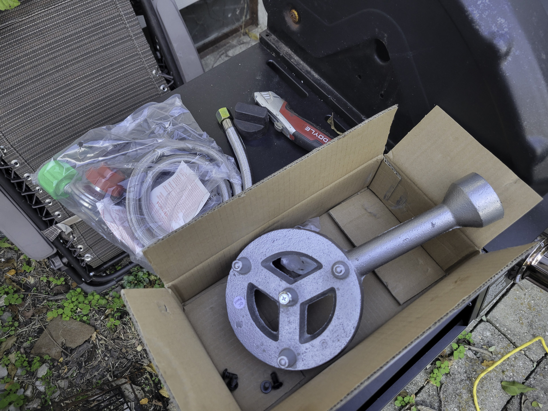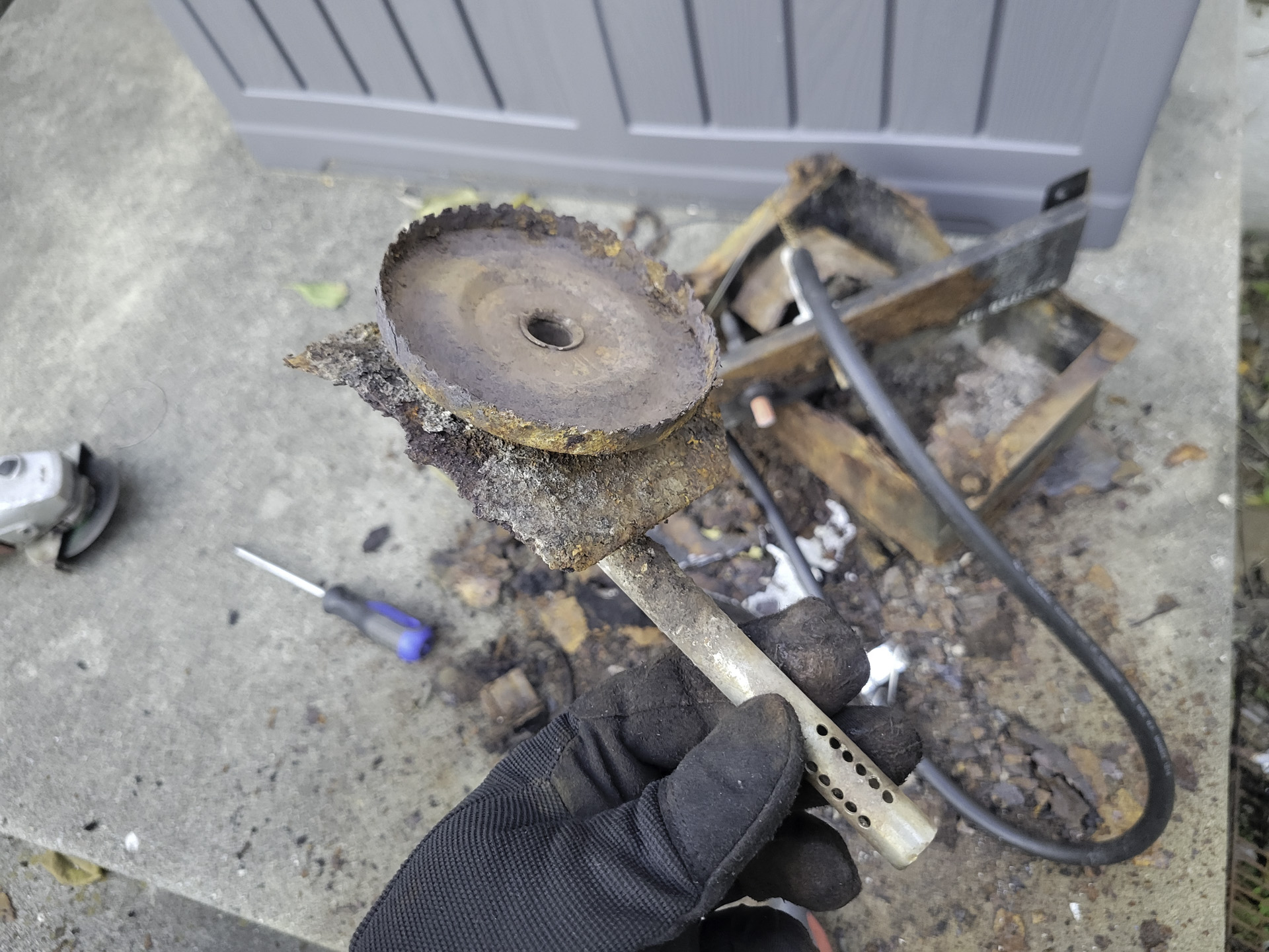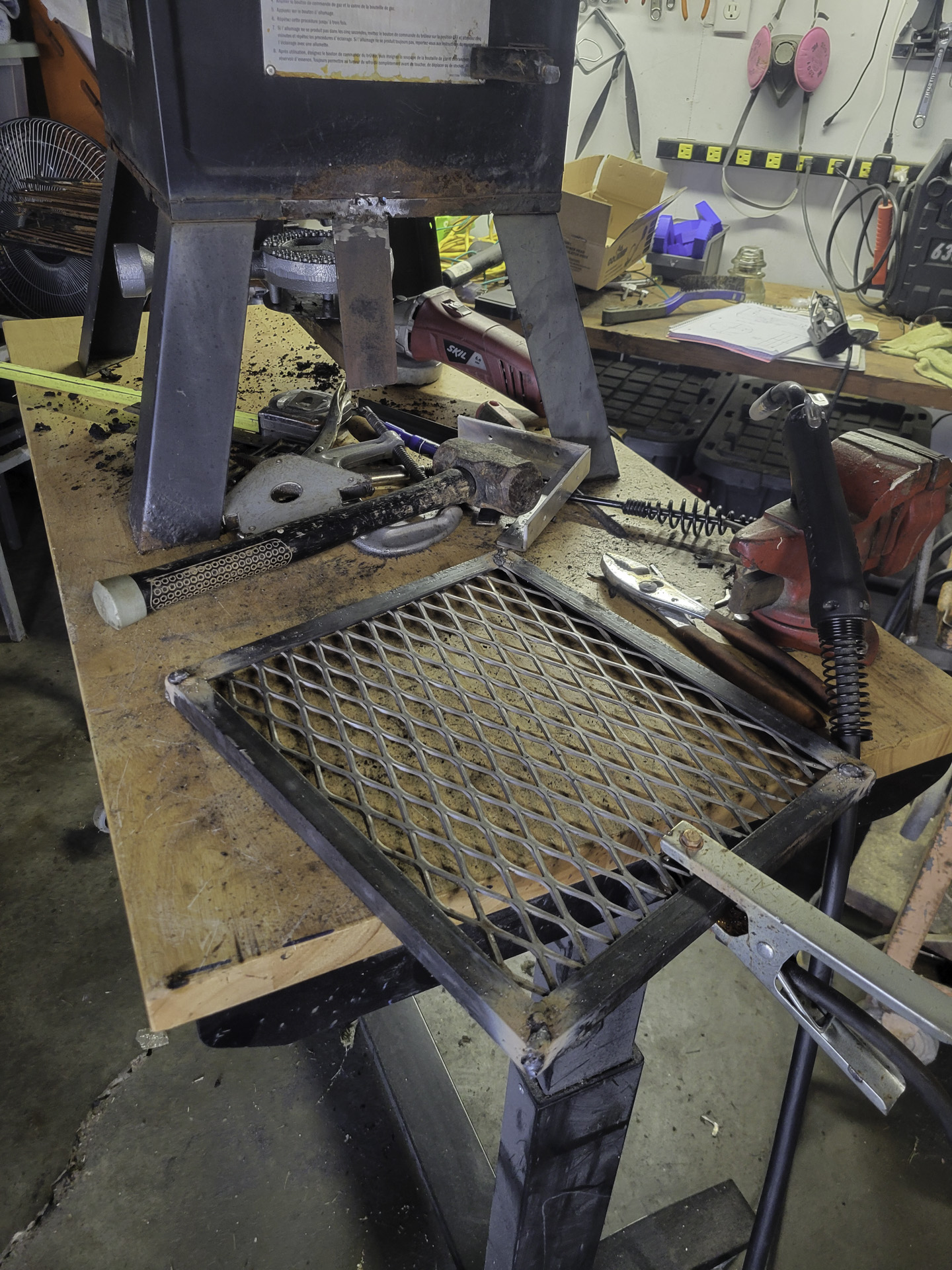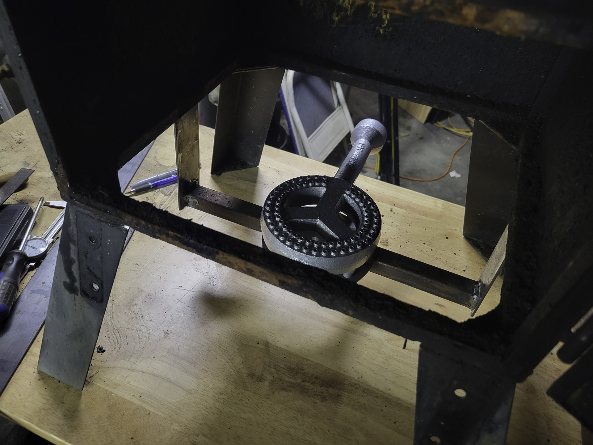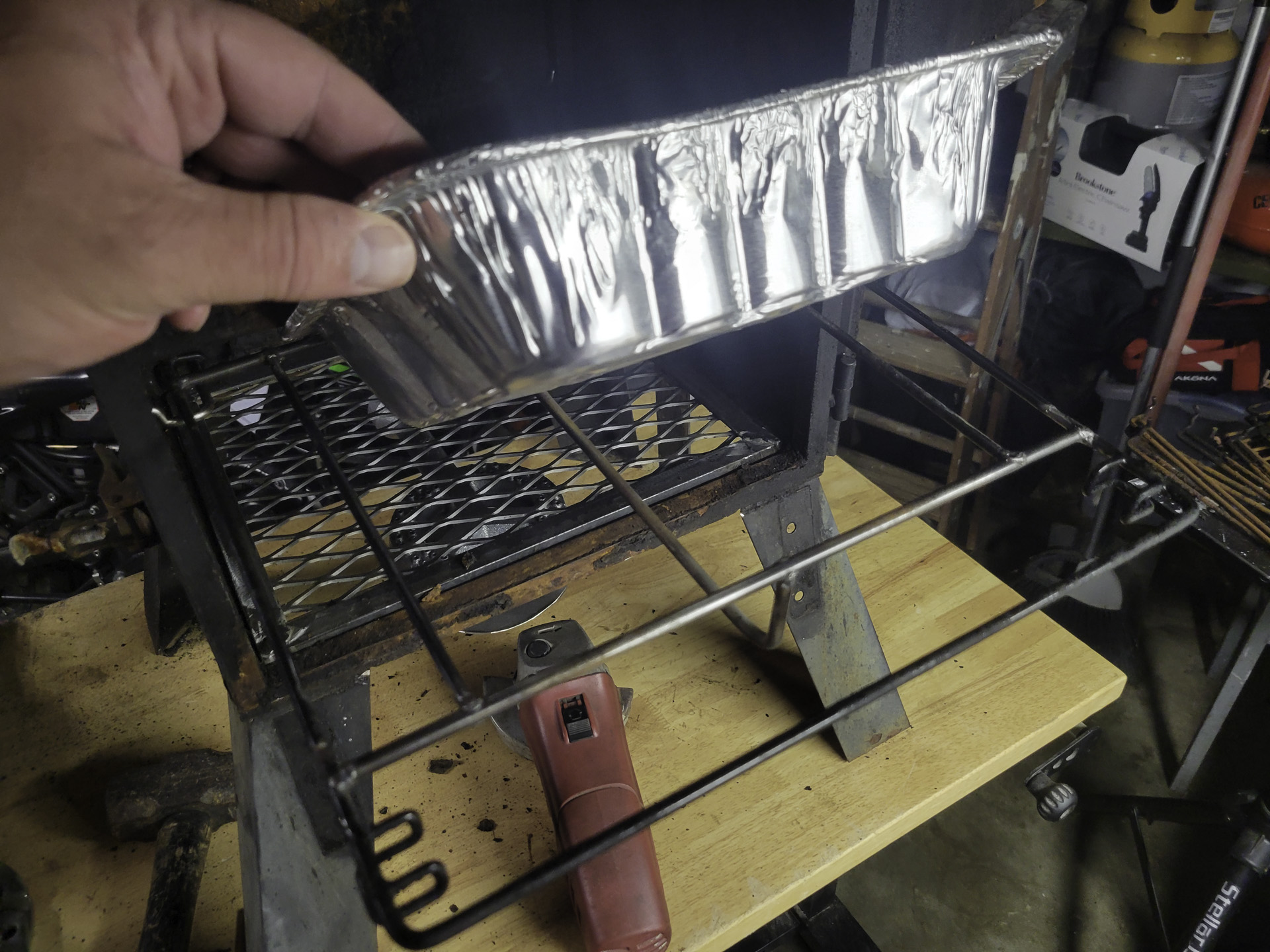 If you've known me for any length of time, you know I love smoked meats of pretty much any variety. I've had and loved my Masterbuilt smoker for YEARS, and I literally ran in until the wood pan rusted through, the brine pan was so concreted it wasn't usable and the burner was essentially dissolving underneath it. It's been down for a while, but Thanksgiving is coming up, and we just couldn't be without the famous Weigold Mountain Smoked Turkey. So I got to work. Here's some pictures of the progress. I'm pleased to report that the old gal is finally smoke ready again after a test run, so as soon as I get something smokable thawed, she's going to get another run. She got a new propane burner, a custom fabricated burner mount, a newly fabricated wood rack and the brine tray holder revised to support a standard disposable aluminum cooking pan.