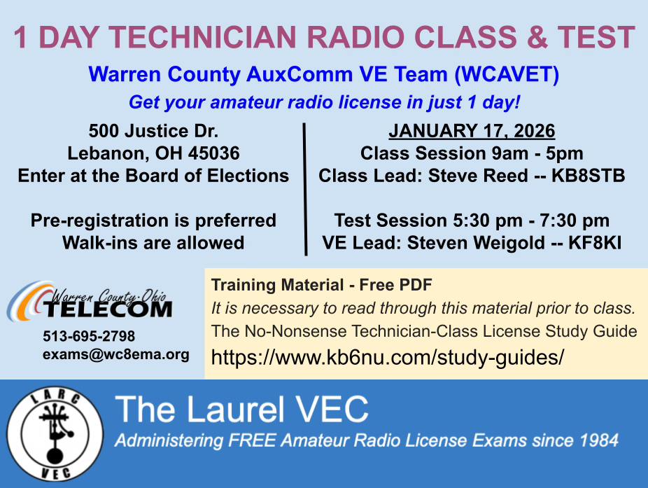 Local friends: If you've been thinking about getting your amateur radio license, you may be interested to know that Warren Co Auxcomm is sponsoring a 1 day Technician class followed by same day testing by the Auxcomm VE Team! There is no charge for the class or testing. If you pass, the FCC charges a $35 application fee which is paid to them.