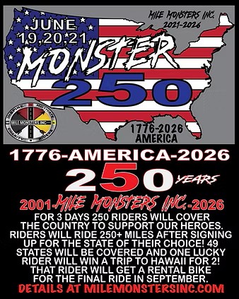 Everyone, in June I'll be joining other riders across the US in celebration of our 250th anniversary, and the 5th anniversary of Mile Monsters Inc., an organization raising funds to help the fight against DMD - DUCHENNE MUSCULAR DYSTROPHY. Please consider supporting the event. Even $1 helps! Donate to support the event here!