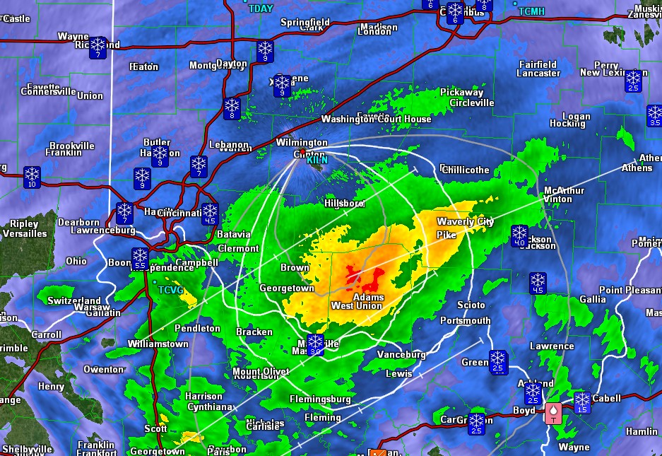 Current radar. Never seen anything quite like this in a winter storm! Looks like a band of freezing rain/sleet moving NNE. Big piles of snow north. Less to the south. Wonder if they're getting thunder with that storm. 10 inches so far in Franklin Co, IN. Looks about the same on the lawn here.
